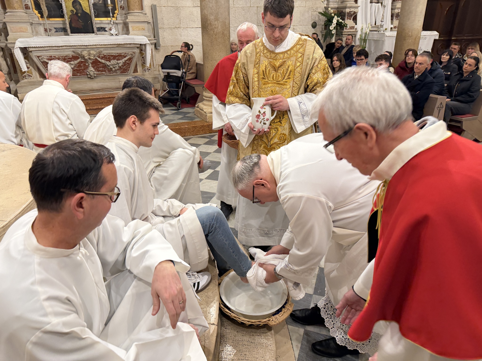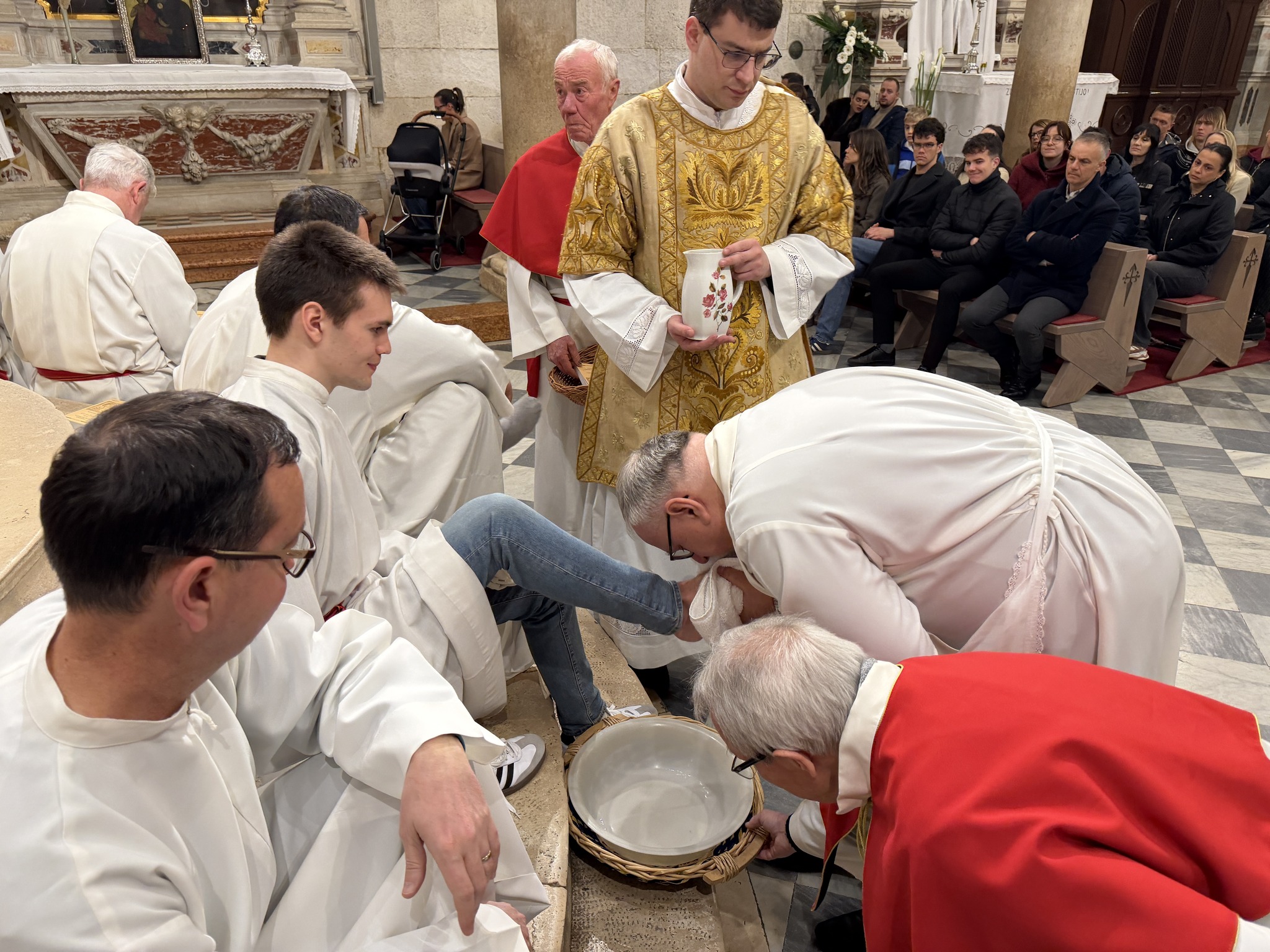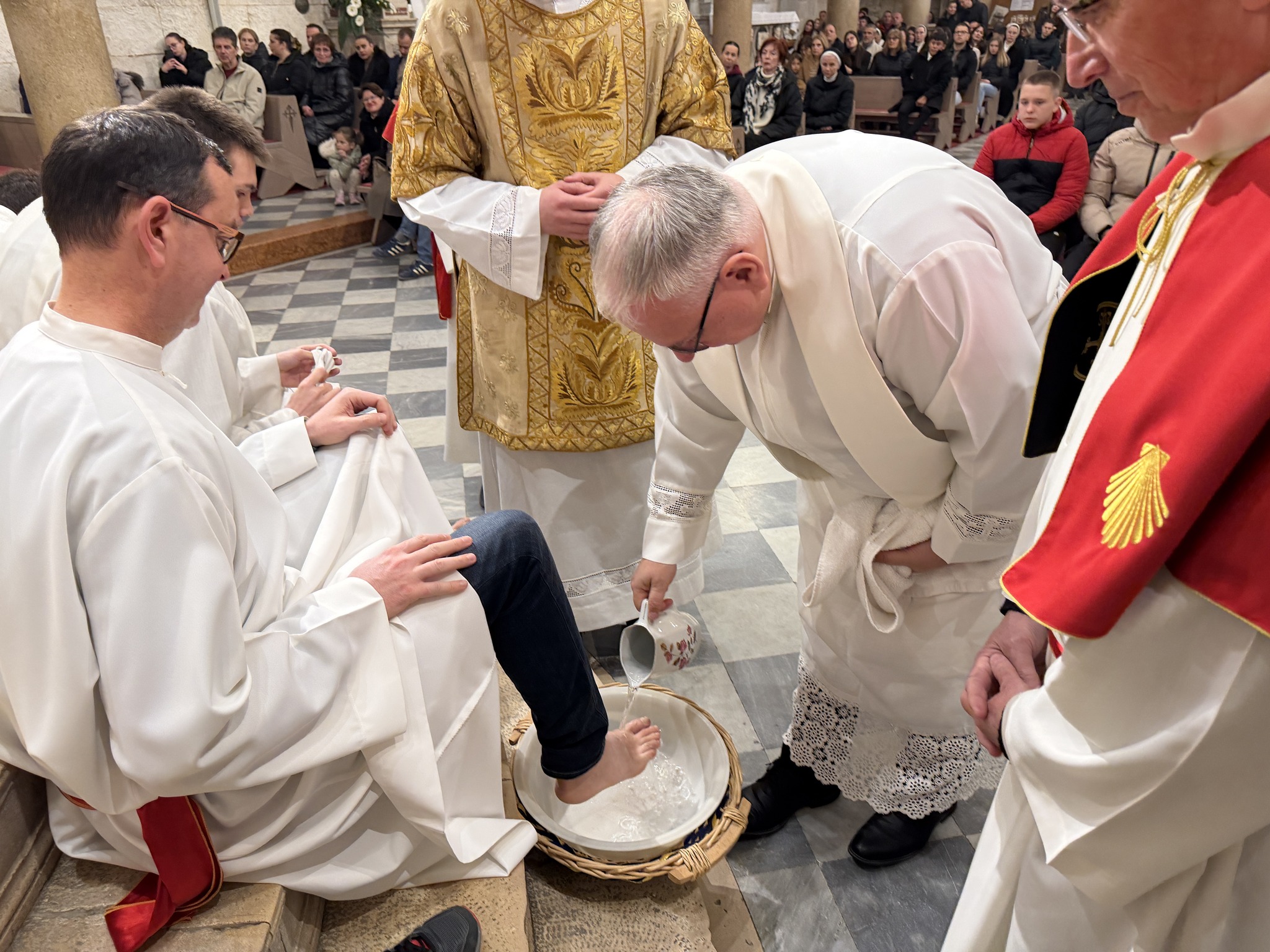 Nakon homilije uslijedio je obred pranja nogu, tijekom kojeg je biskup oprao noge dvanaestorici odraslih muškaraca, simbolizirajući Kristovo služenje. Po završetku pričesti, biskup je u svečanoj tišini prenio posvećene hostije na pokrajnji oltar šibenske katedrale. Tamo se, u sabranosti s brojnim vjernicima, zadržao u meditaciji i molitvi, uvodeći zajednicu u tišinu Getsemanske noći i bdjenje s Kristom uoči muke.