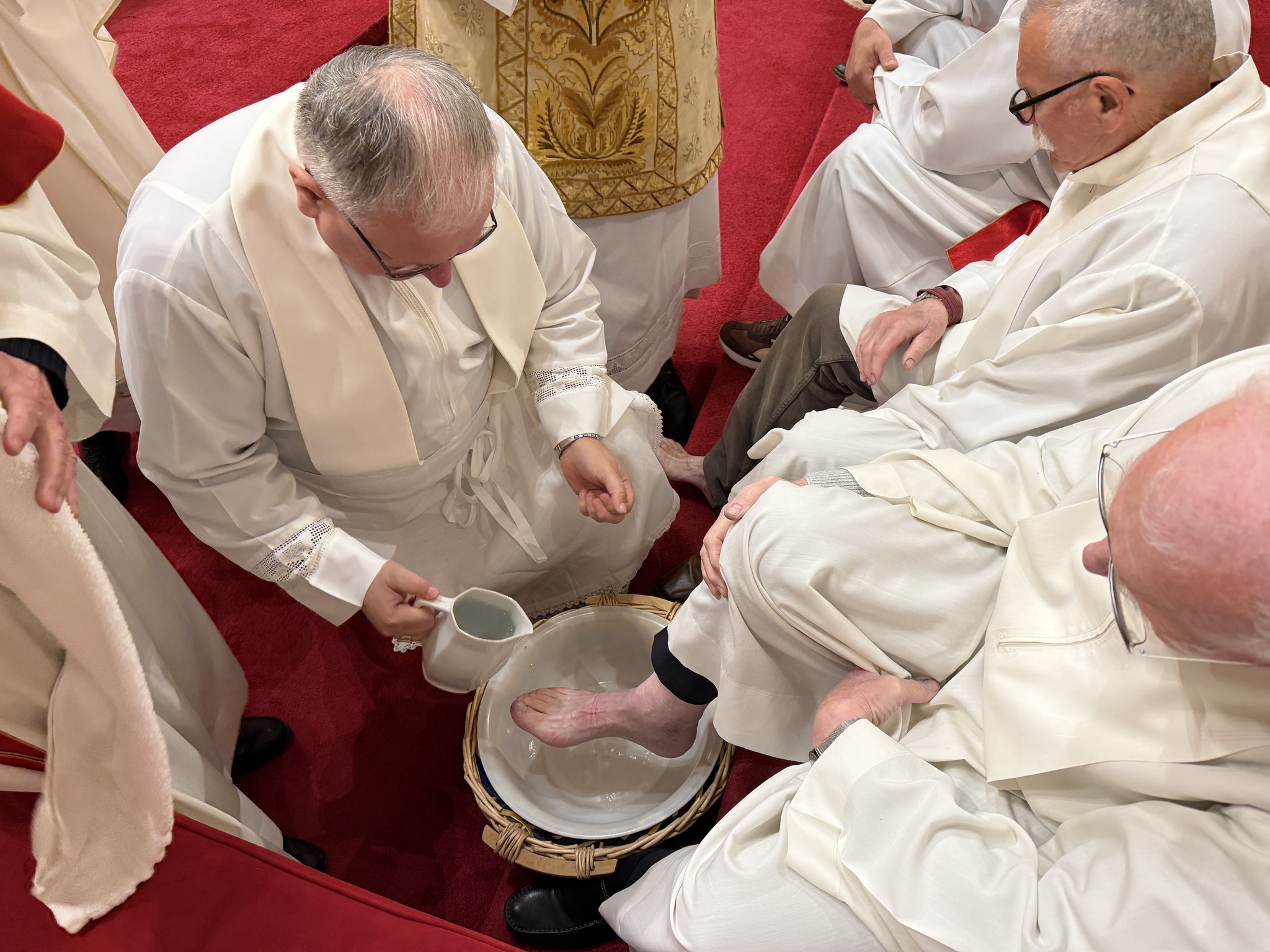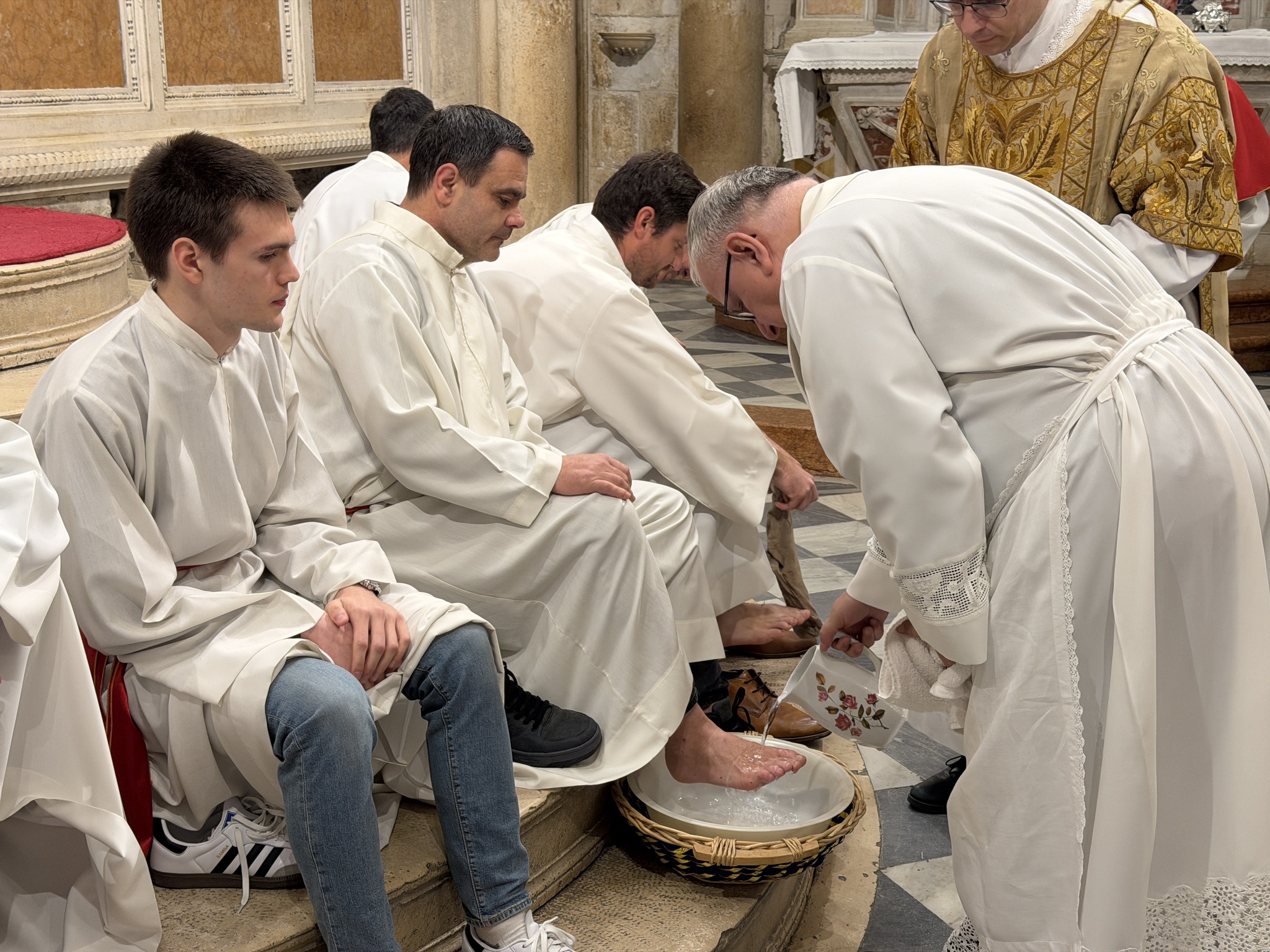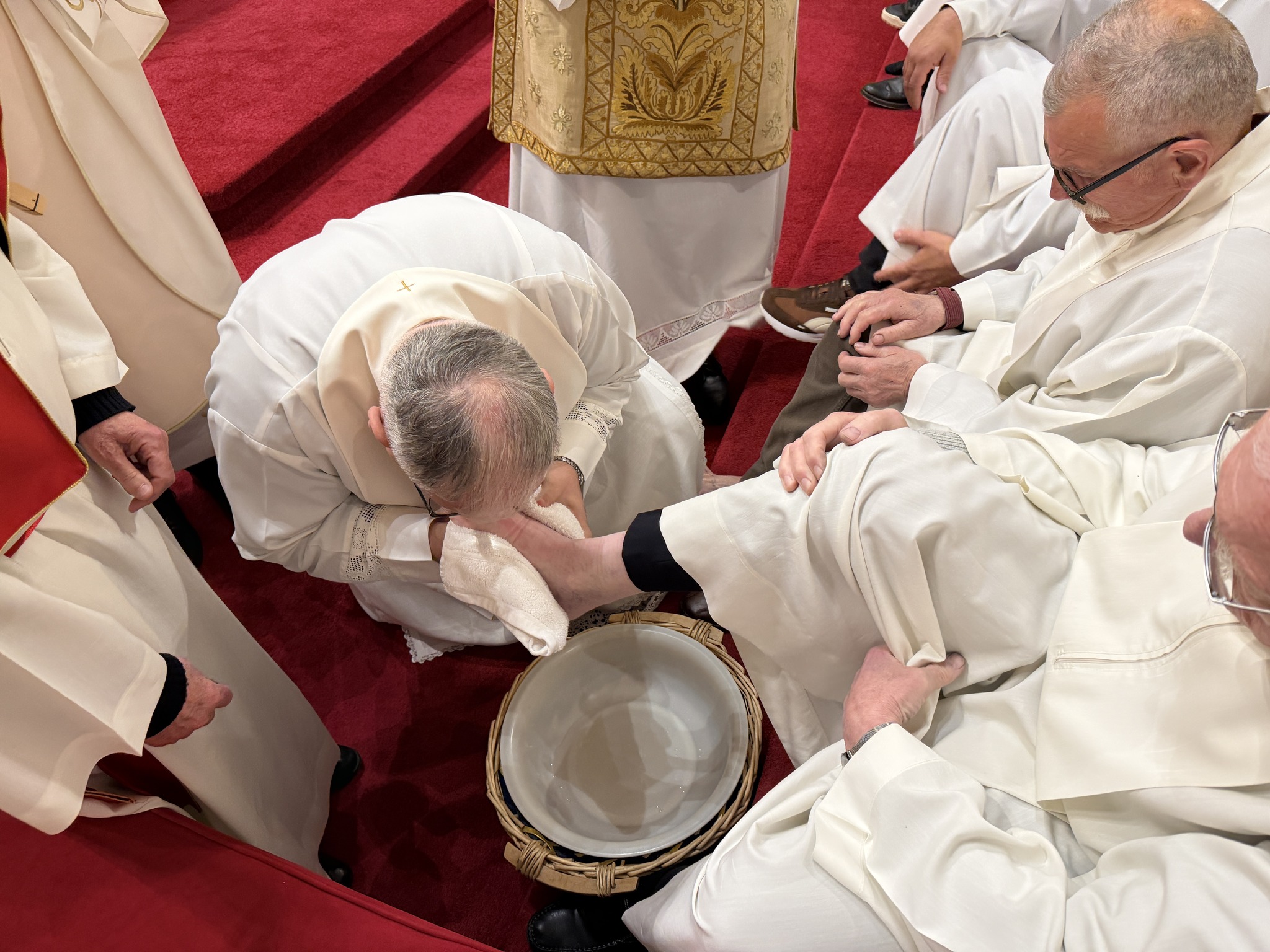 Nakon homilije uslijedio je obred pranja nogu, tijekom kojeg je biskup oprao noge dvanaestorici odraslih muškaraca, simbolizirajući Kristovo služenje. Po završetku pričesti, biskup je u svečanoj tišini prenio posvećene hostije na pokrajnji oltar šibenske katedrale. Tamo se, u sabranosti s brojnim vjernicima, zadržao u meditaciji i molitvi, uvodeći zajednicu u tišinu Getsemanske noći i bdjenje s Kristom uoči muke.