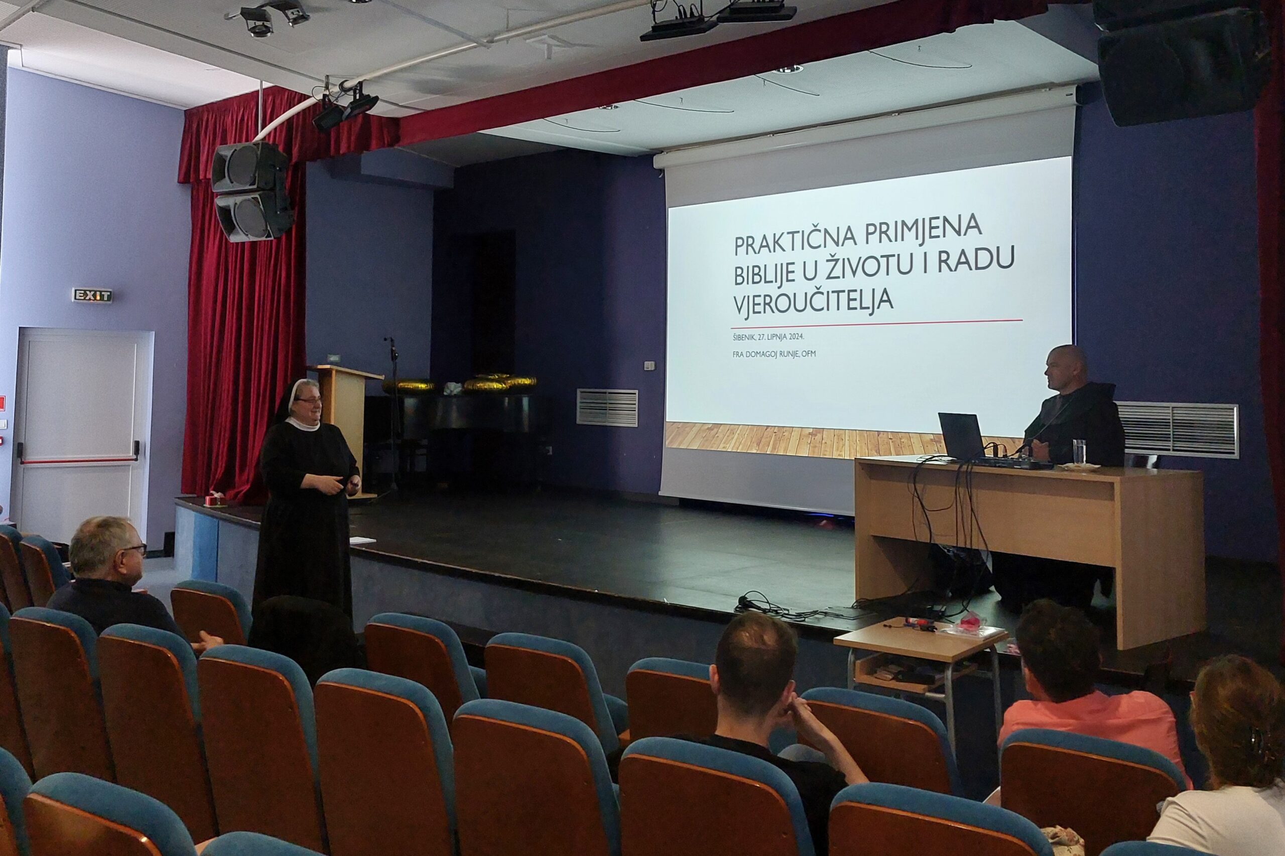Prof. Runje govorio je o ”Praktičnoj primjeni Biblije u životu i radu vjeroučitelja”. Opisao je položaj i značenje Biblije u životu čovjeka, vjeroučitelja i u liturgijskom kontekstu. Naveo je i opisao niz konkretnih načina na koje je moguće Bibliju učiniti sastavnim i redovitim dijelom i svakodnevnog života i nastavnoga procesa. Poseban naglasak stavio je na Lectio divina, tradicionalni molitveni pristup svetopisamskim tekstovima, i detaljno prikazao svaki njegov korak. U završnom dijelu praktično je proveo vjeroučitelje kroz njih. Predvođeni fra Domagojem vjeroučitelji su, kao pojedinci i kao zajednica, još jednom osluškivali evanđeoski ulomak i ulazili u dijalog s Njim, dopuštajući da ih on nadahnjuje i oblikuje.