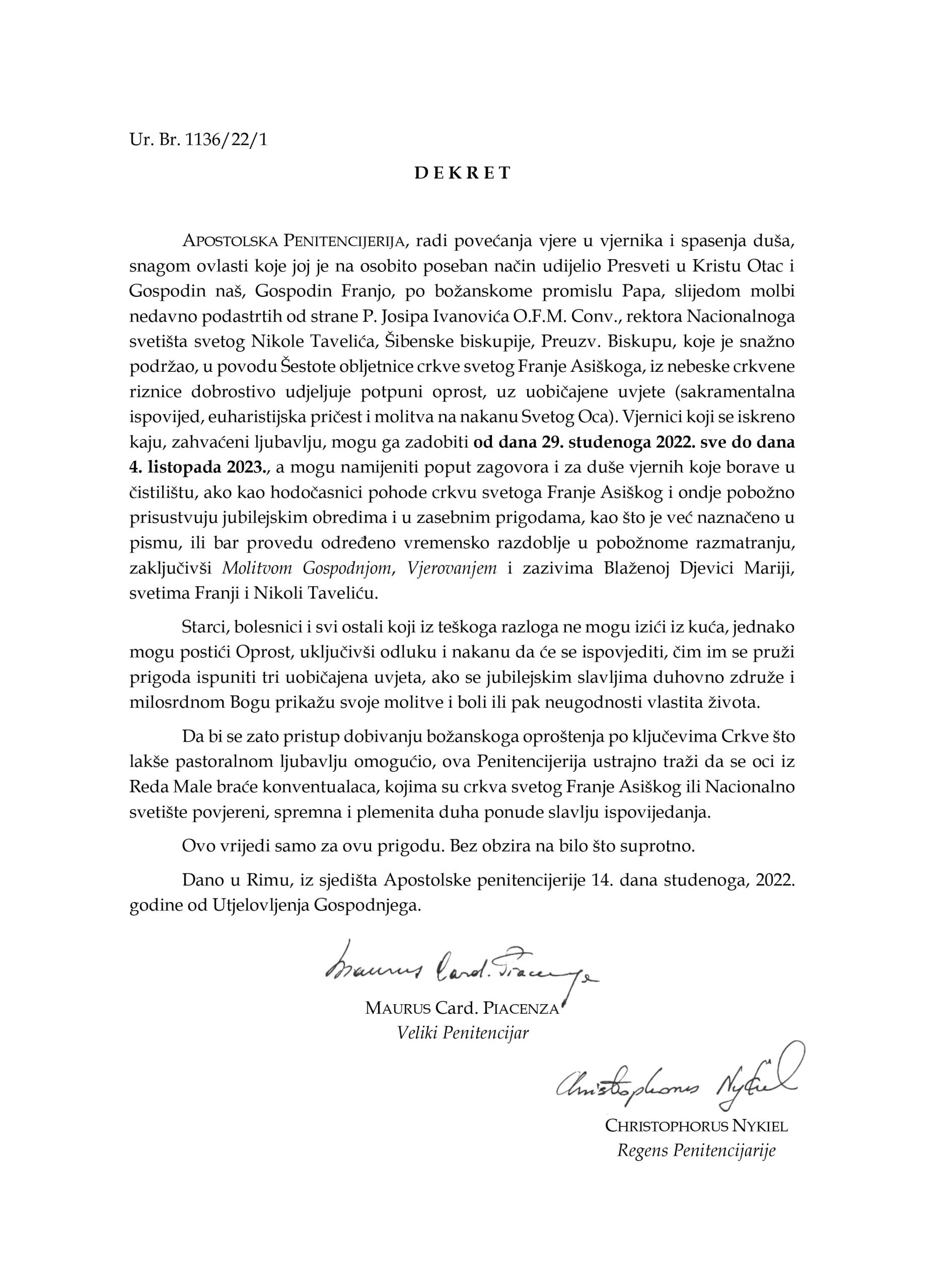 Povodom ovih obljetnica Apostolska penitencijerija, na molbu Samostana sv. Frane i uz suglasnost šibenskoga biskupa mons. Tomislava Rogića, na blagdan sv. Nikole Tavelića o.g., omogućila je vjernicima i hodočasnicima da u crkvi sv. Frane u Šibeniku od 29. studenoga 2022. do 4. listopada 2023. godine izmole potpuni oprost poštujući uobičajene uvjete (sakramentalna ispovijed, euharistijska pričest i molitva na nakanu Svetog Oca).