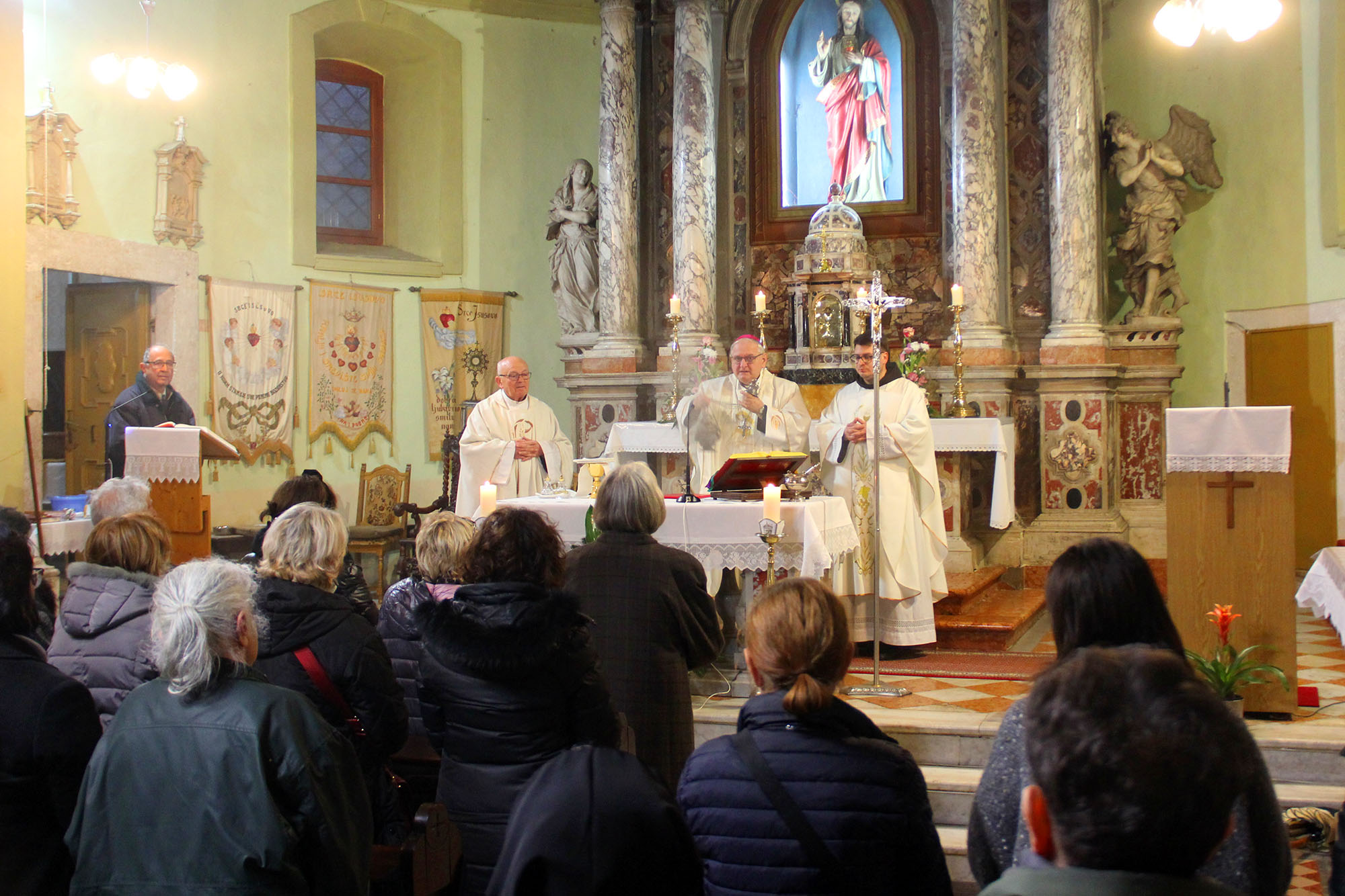 Svečano misno slavlje predvodio je šibenski biskup mons. Tomislav Rogić. Na samom početku mise blagoslovljeni su obnovljeni kipovi Gospe Lurdske i svete Bernardice, čime je simbolično obilježen stoljetni put pobožnosti u ovom šibenskom samostanu. Uz biskupa su koncelebrirali upravitelj samostana i crkve svetog Lovre fra Josip Klarić, te fra Jerko Kolovrat, profesor na KBF-u u Splitu. Posluživao je đakon don Robert Maretić.